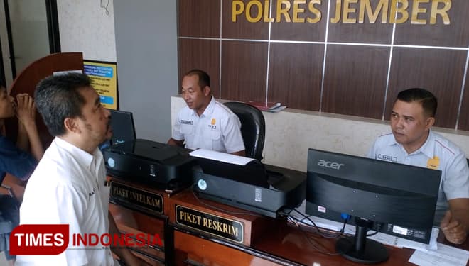 TIMES Timika/Wakil Ketua Bidang Litbang dan IT DPD Partai Perindo Kebupaten Jember, Ahmad One Prastiono saat melaporkan Ketua DPD Partai Perindo Kabupaten Jember Hanung Prijobodo ke Polres Jember, Senin (6/5/2019). (FOTO: Dody Bayu/TIMES Indonesia)